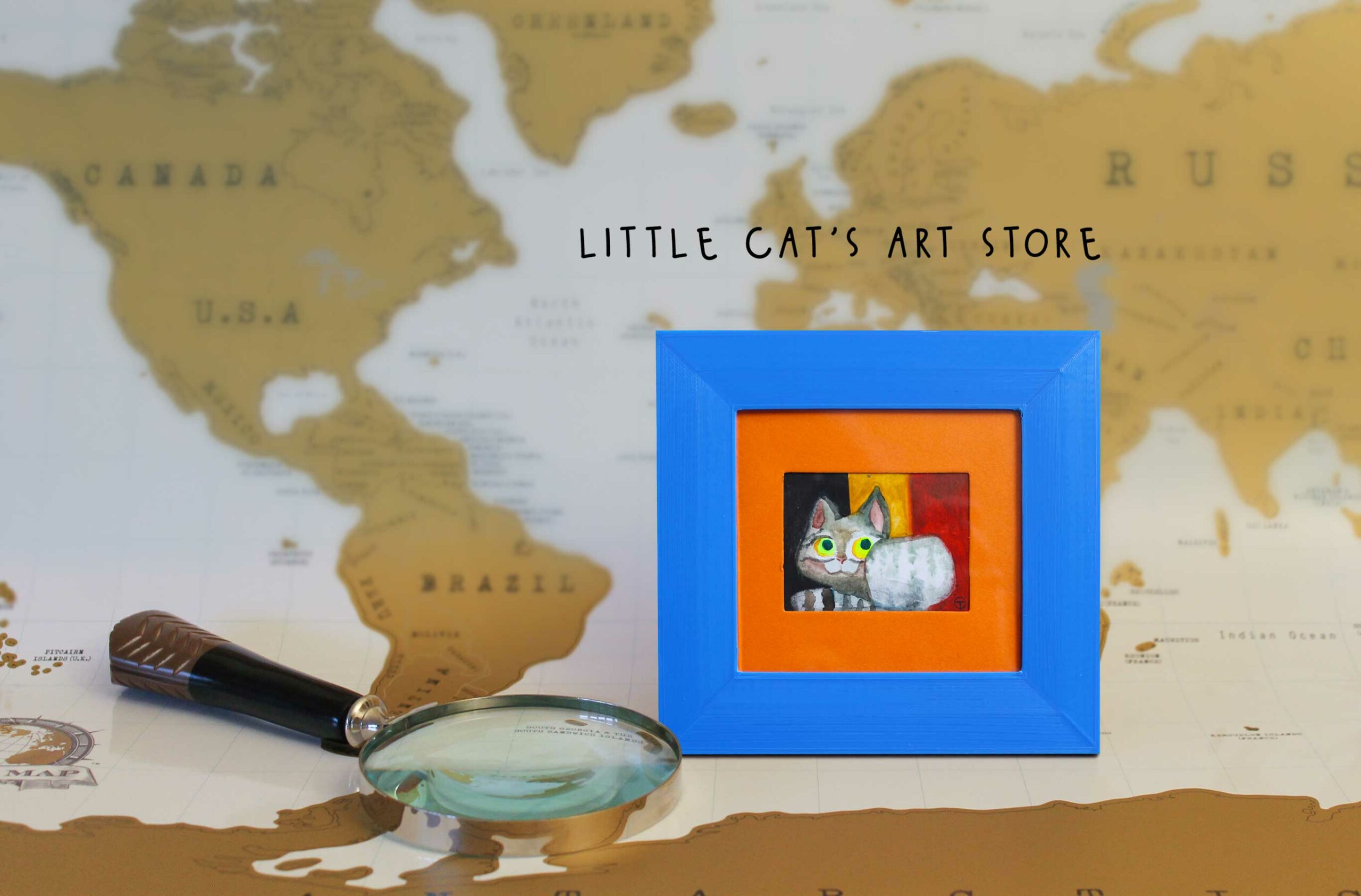 This cute little picture is a part of art series including small paintings which illustrate funny cats posing in front of different country flags, for example the United Kingdom, England, France, Germany, Italy, Norway, Sweden, Denmark, Japan and Greece.