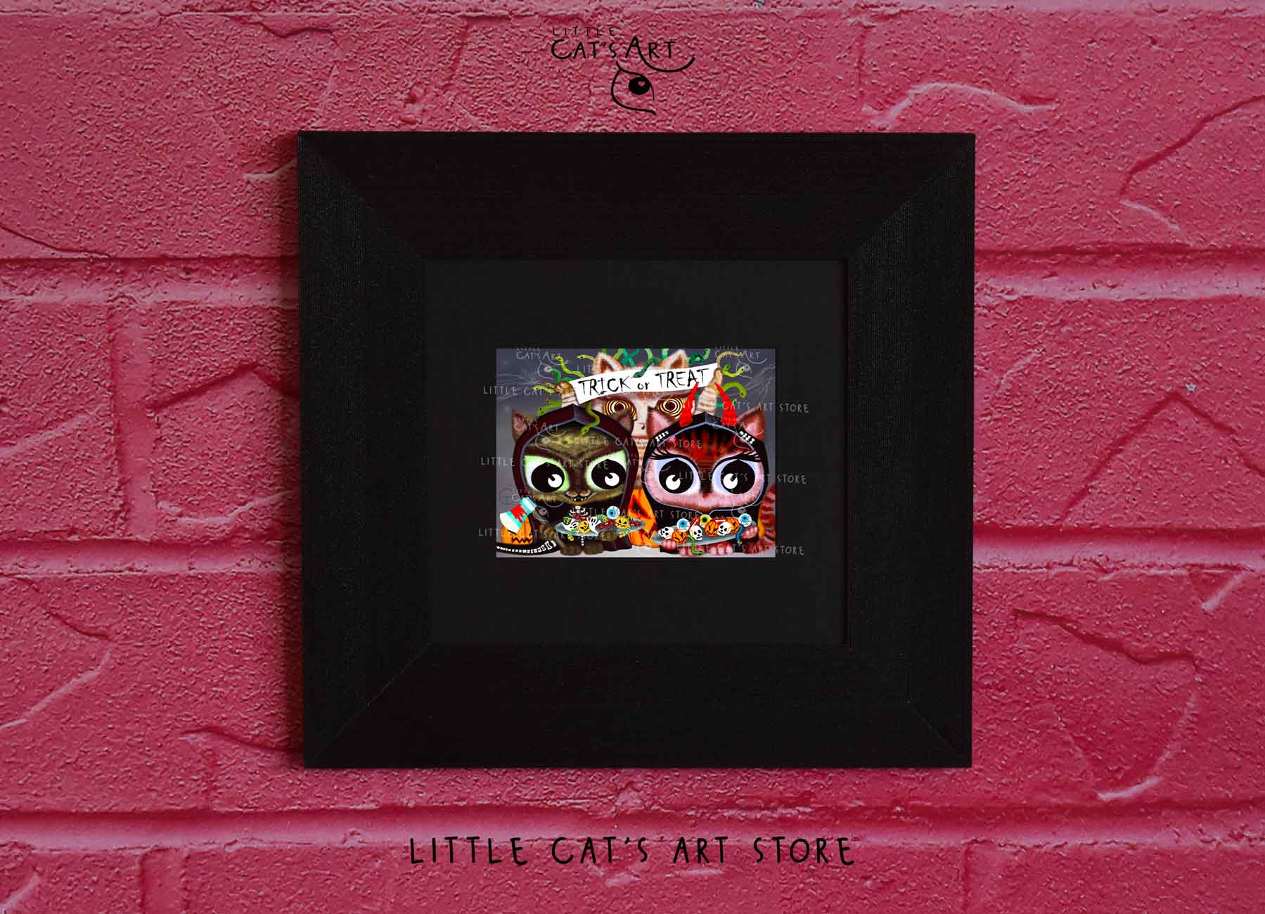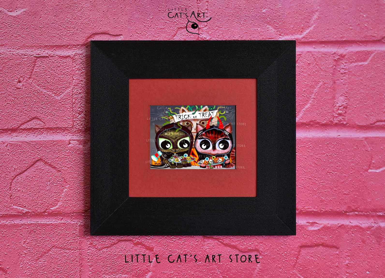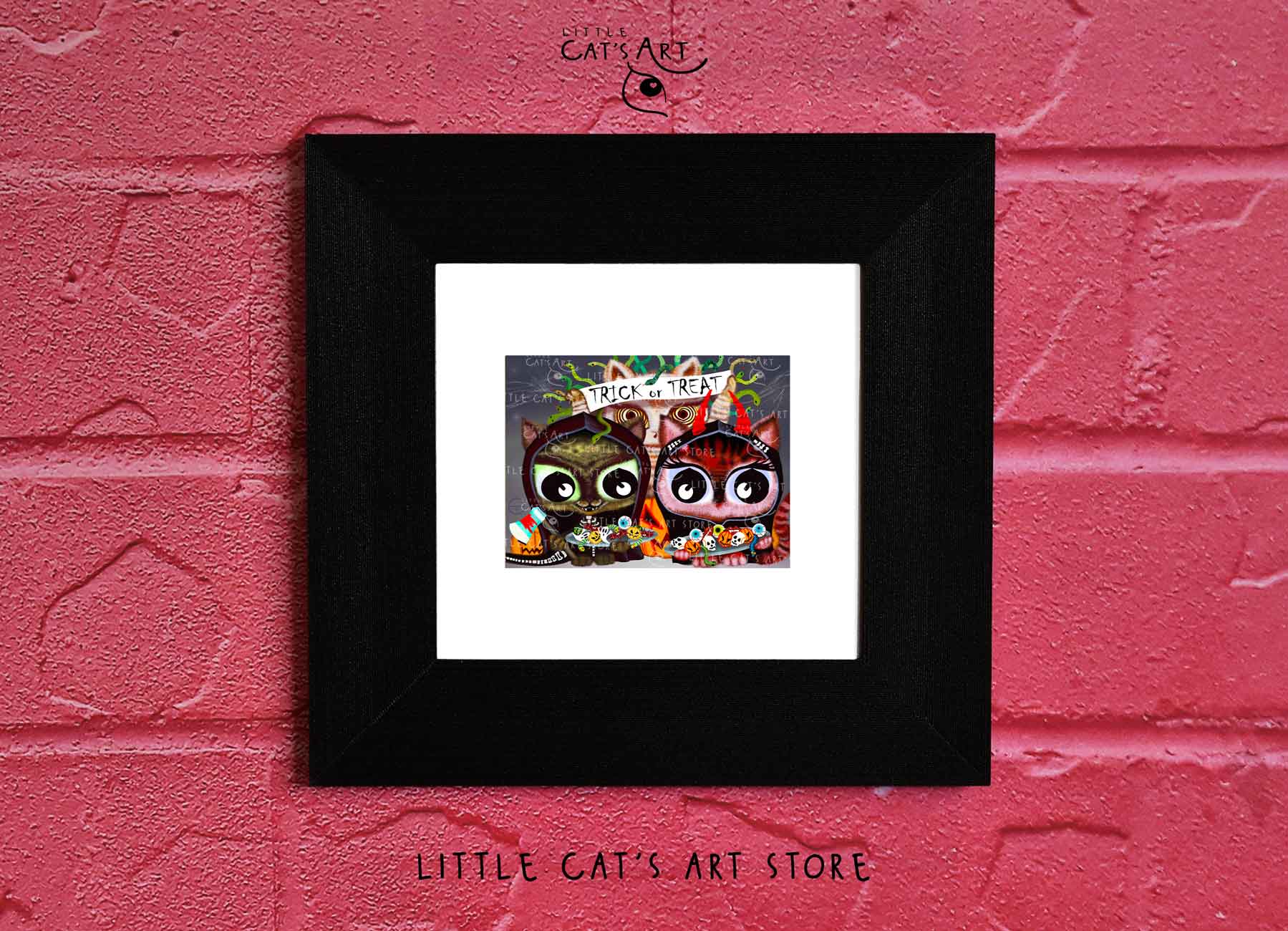 We hope you enjoy the Happy Halloween Trick or Treat cat art print as much as our artist enjoyed making it.