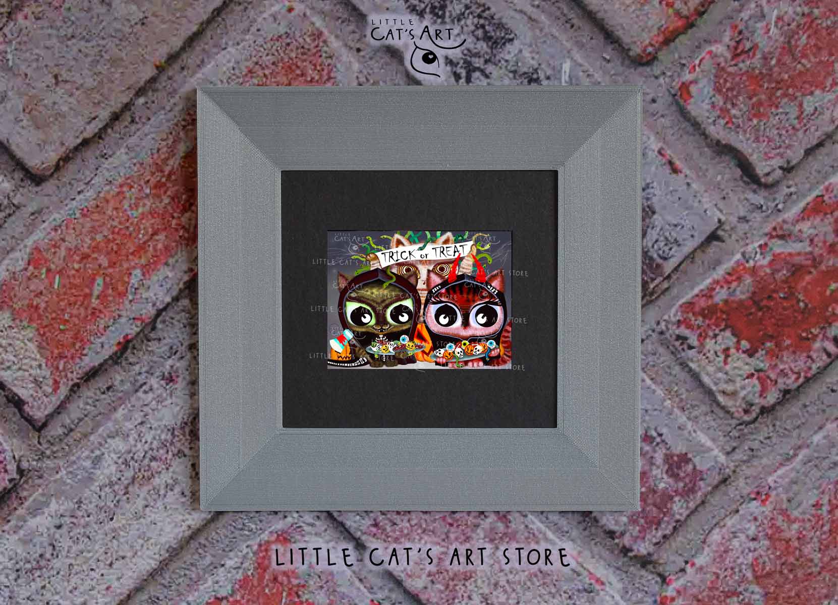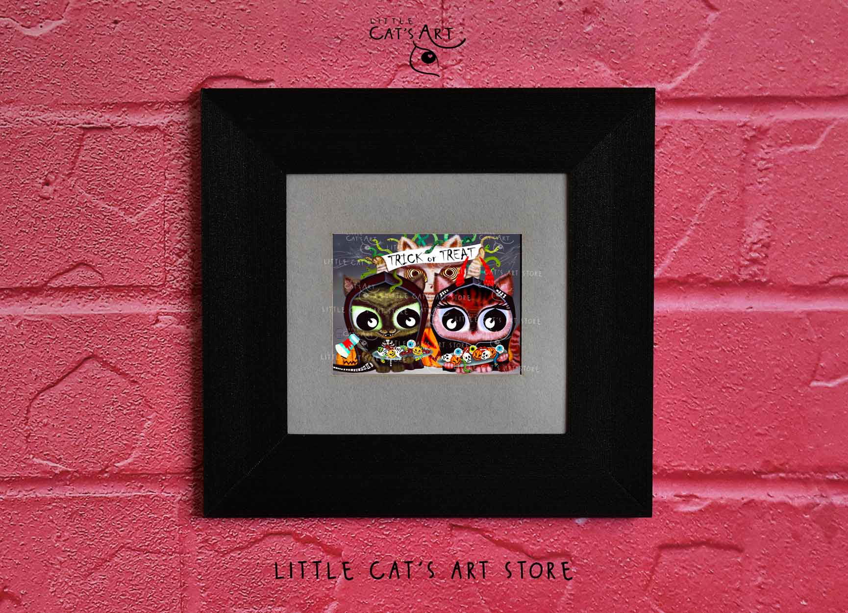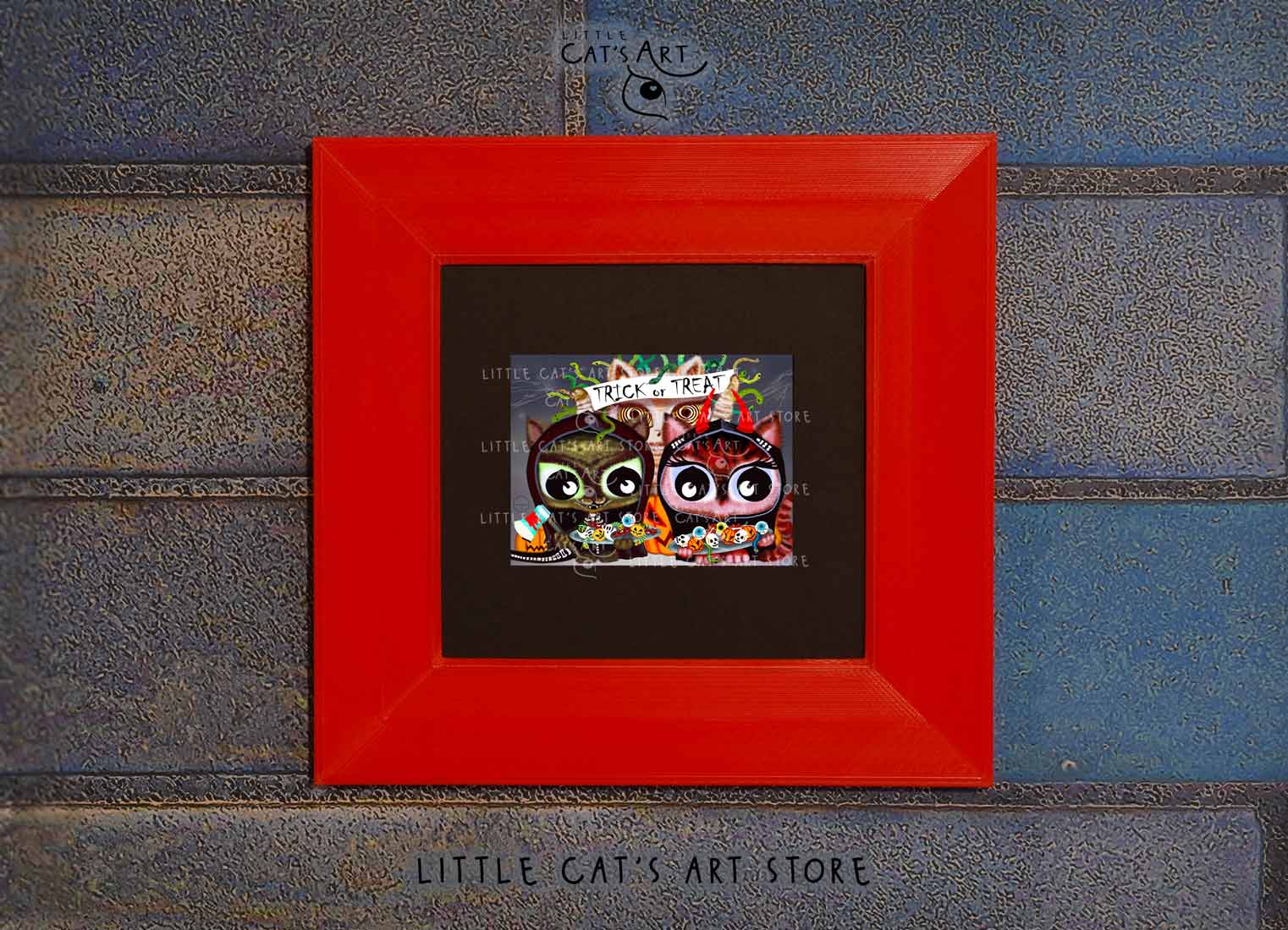 We hope you enjoy the Happy Halloween Trick or Treat cat art print as much as our artist enjoyed making it.