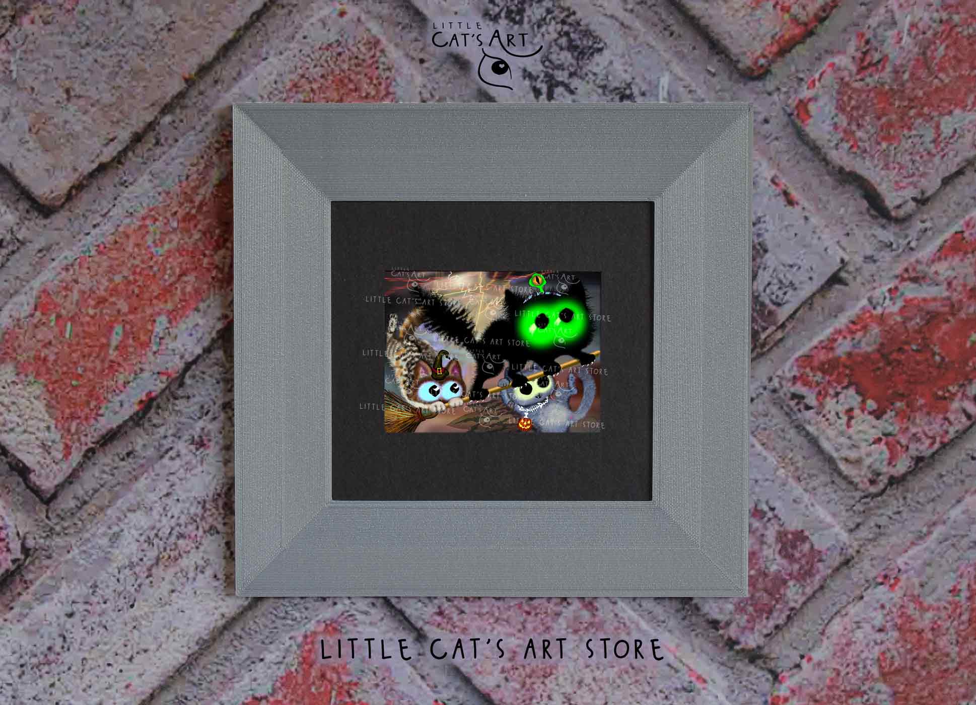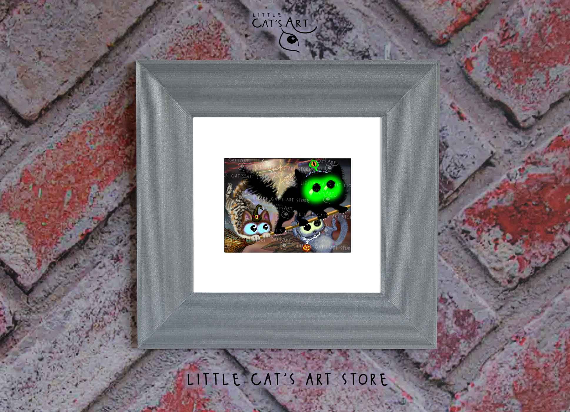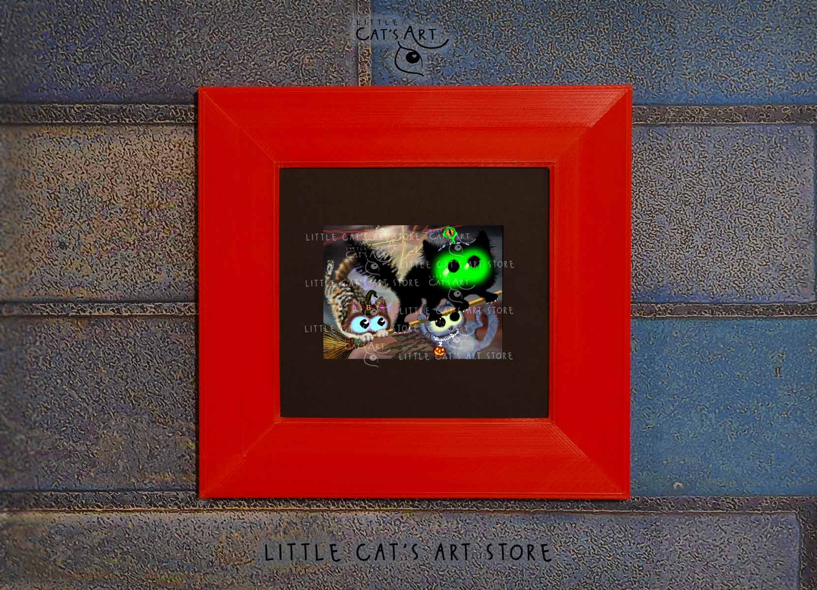 We hope you enjoy the Happy Halloween witch cat & black alien cat art print as much as our artist enjoyed making it.