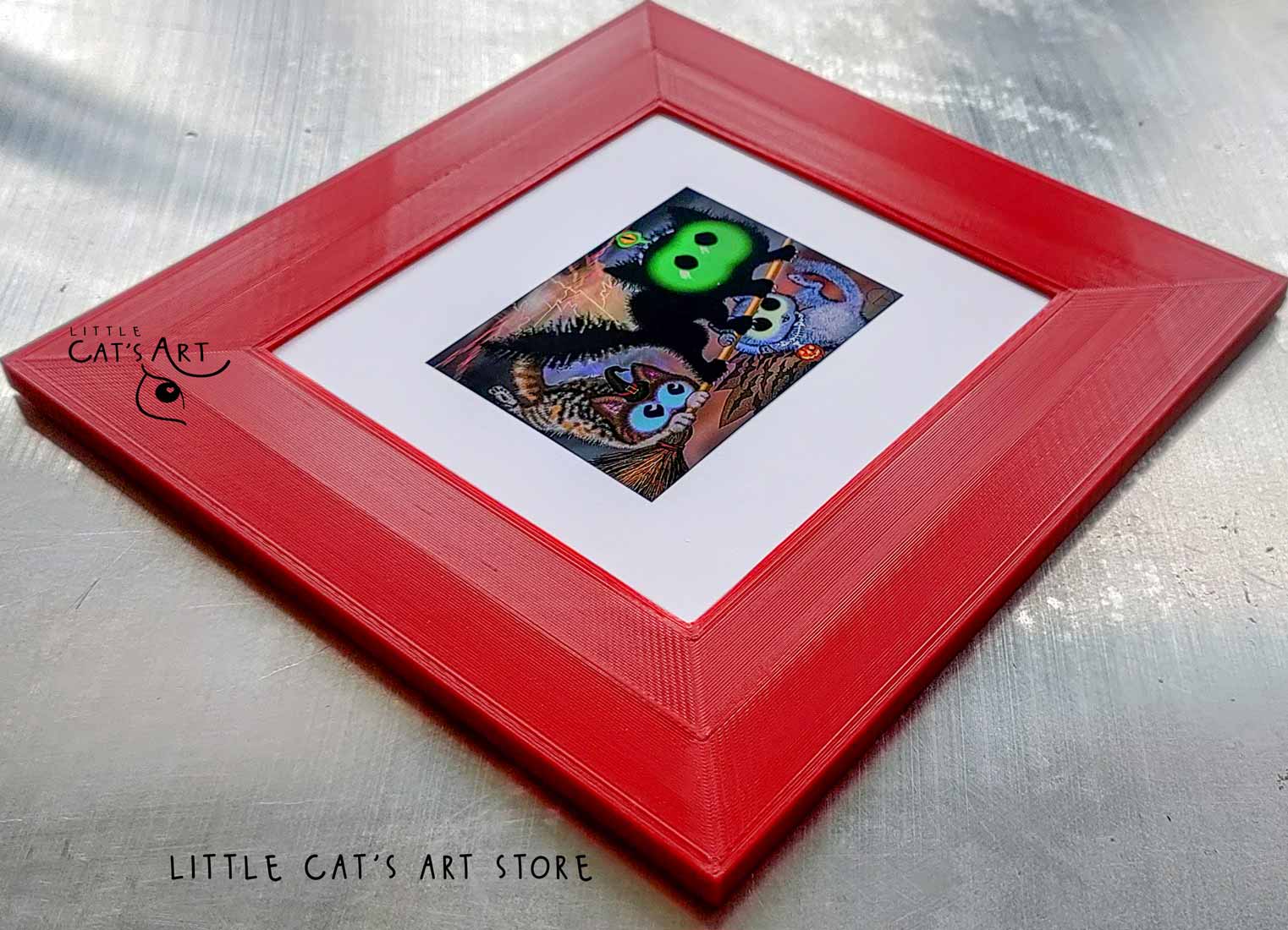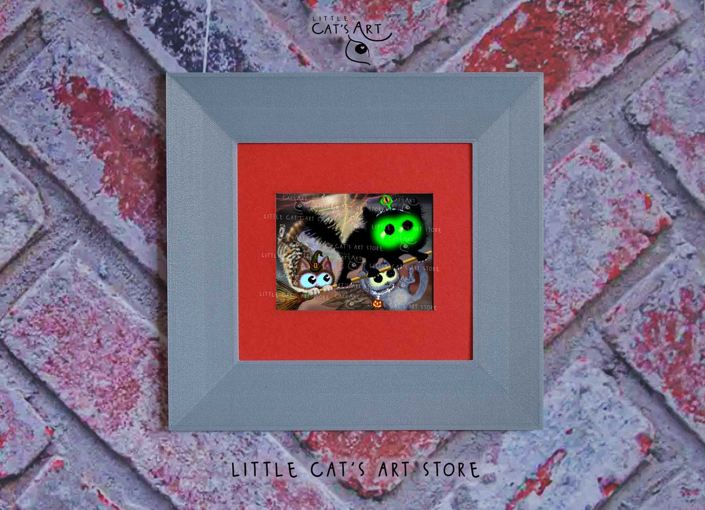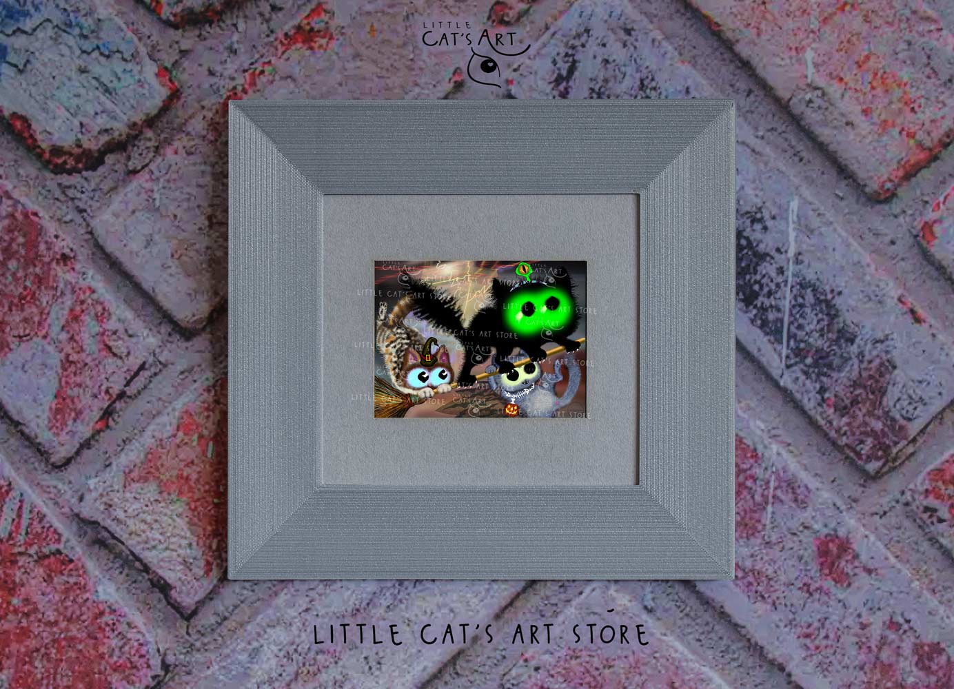 We hope you enjoy the Happy Halloween witch cat & black alien cat art print as much as our artist enjoyed making it.