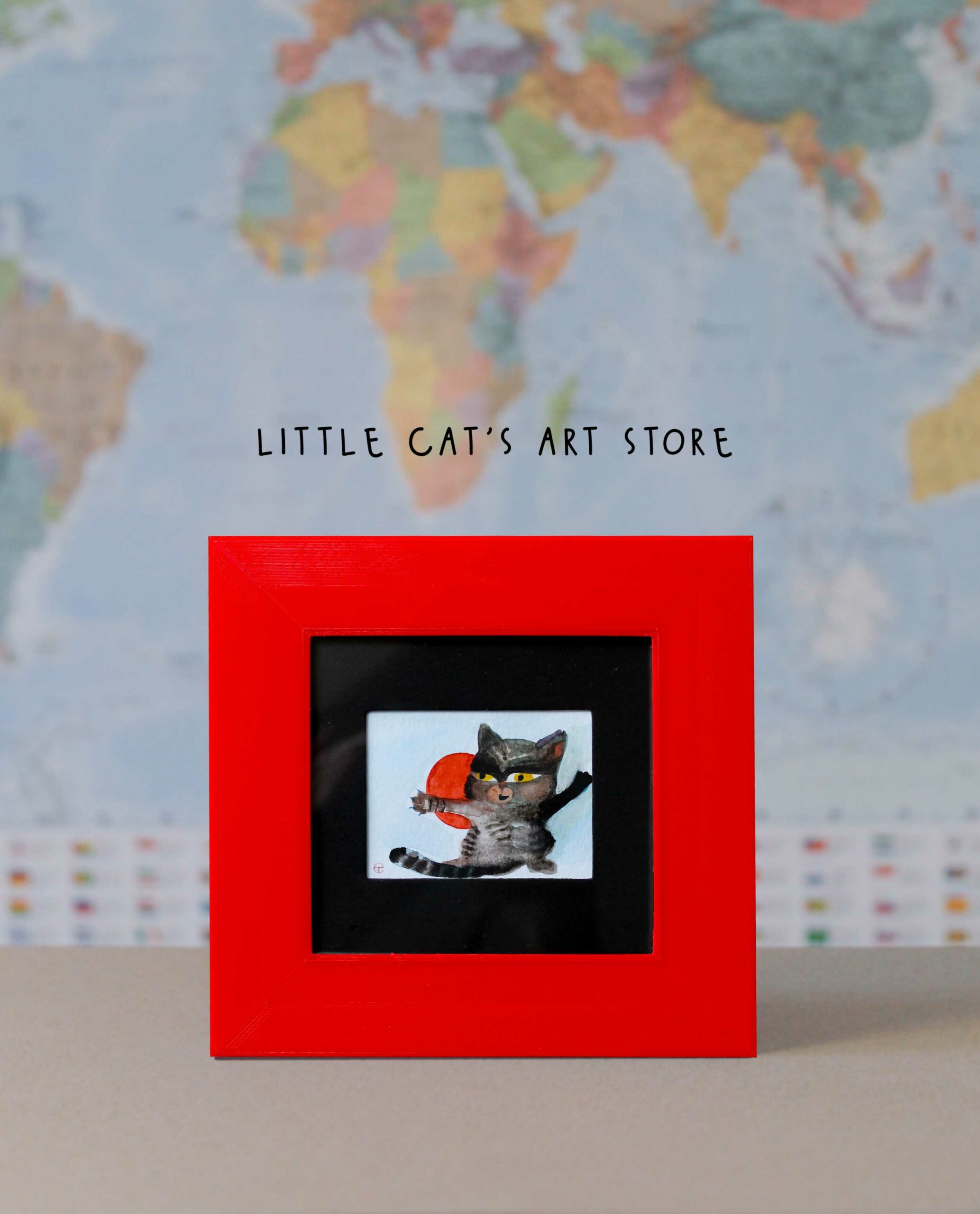 This cute little picture is a part of art series including small paintings which illustrate funny cats posing in front of different country flags, for example the United Kingdom, England, France, Germany, Italy, Norway, Sweden, Denmark, Japan and Greece.
