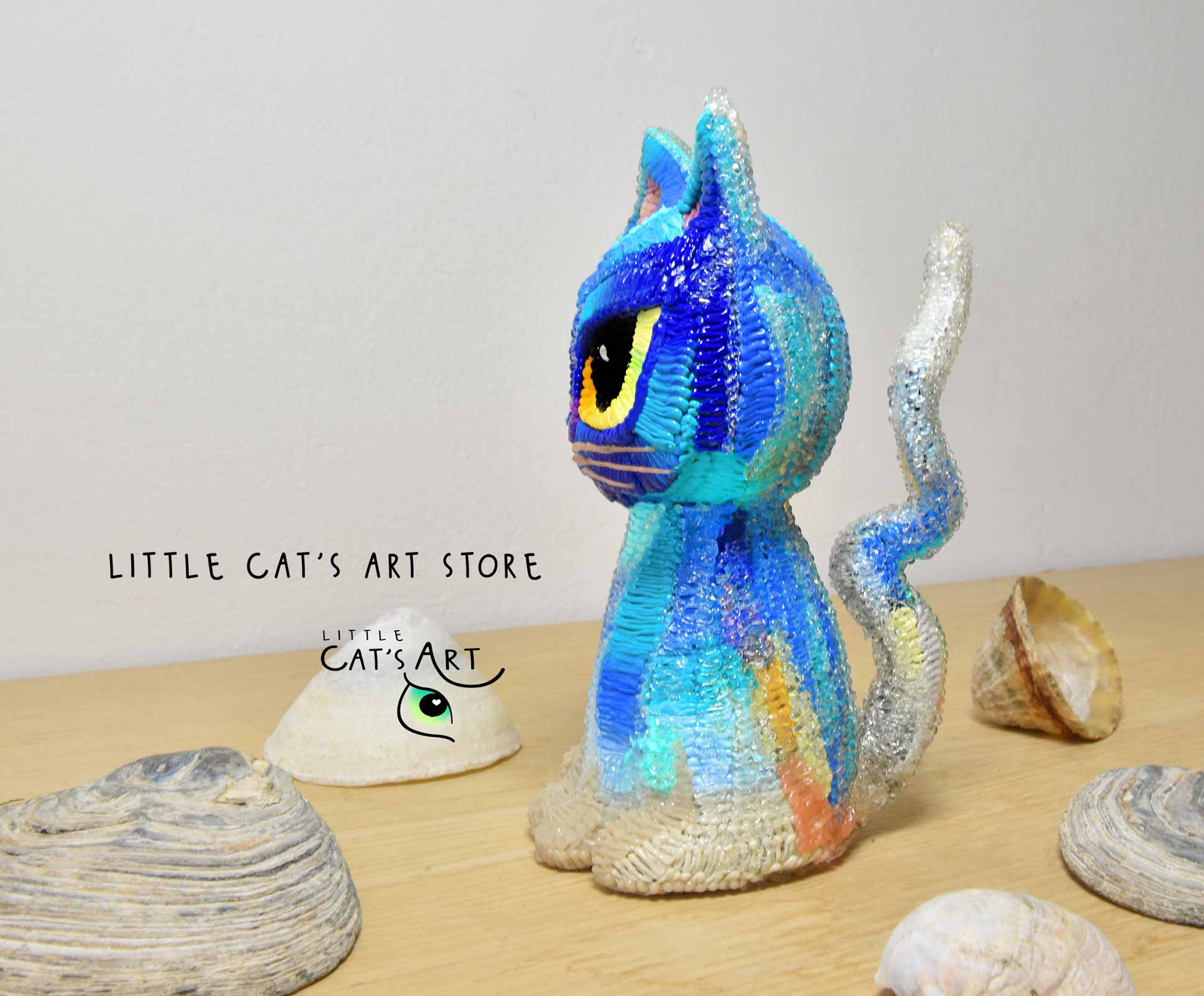 Experience the captivating beauty of the Sandy Paws cat figurine, inspired by majestic seas, with its blue and turquoise coat, mesmerizing sunny eyes, wavy transparent tail and cute sandy paws.