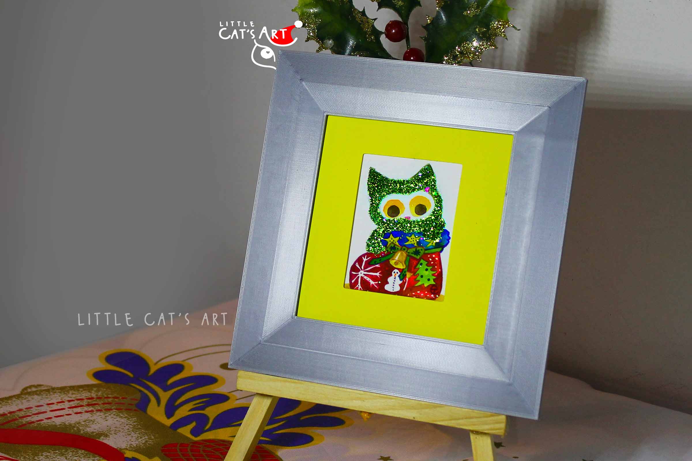 As part of our Shiny Christmas Cat Art Collection, this piece has a dazzling metallic effect. It shines beautifully near light sources, like glowing candles, sparkling Christmas lights, or a cosy bedside lamp. This glittery kitty brings charm and warmth to any holiday display.